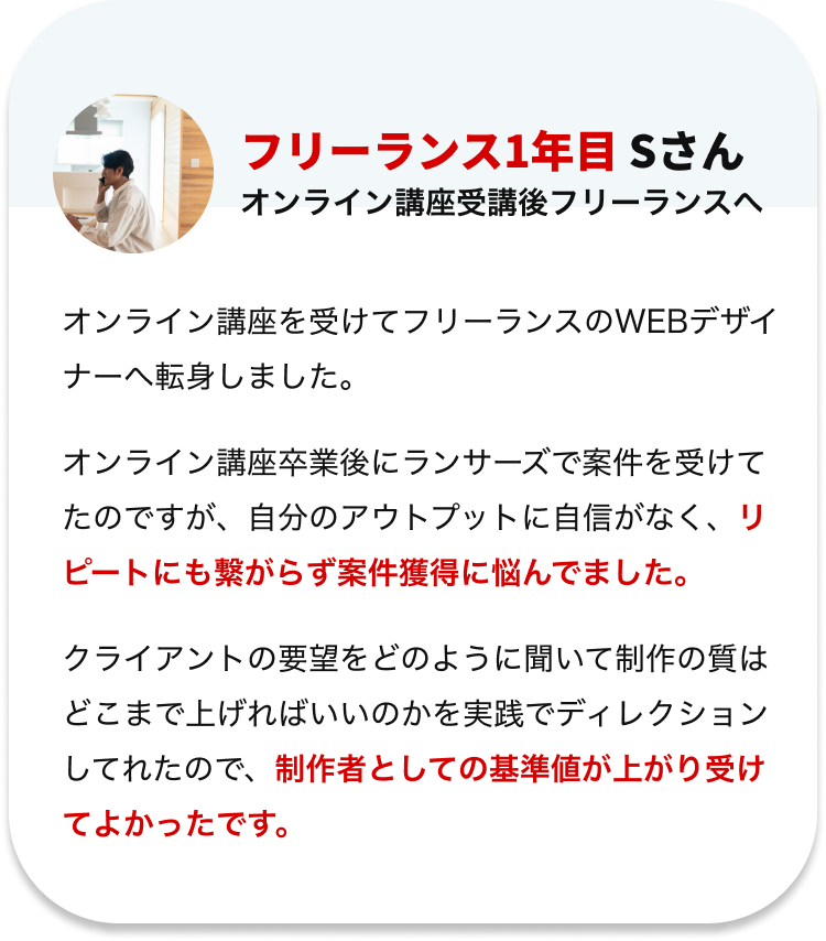 講師は駆け出しWebデザイナーの方にキャリアアドバイスを行ってきた経験もございます。安心してご相談ください。